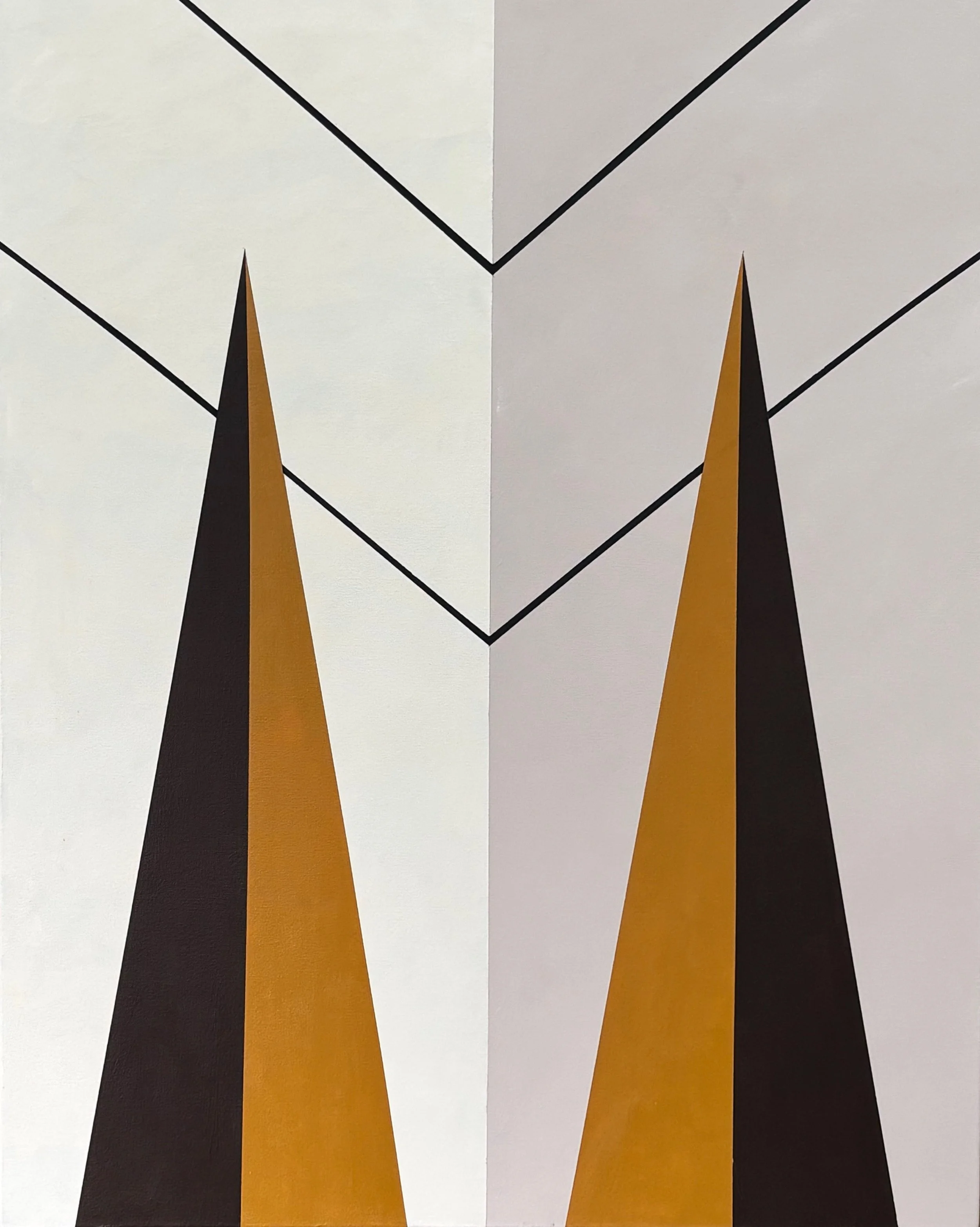 Through geometric abstraction, the use of a limited palette, and hard-edge lines, I intend to create a space of reflection that allows for a moment of stillness and a moment to breathe. Each painting seeks to become a slowing down in which the viewers can become more aware of their mental habits. My work does not seek to tell a story or represent a subject. Instead, it invites presence — a direct encounter with the silent geometry of awareness itself: the stillness between automatic mental responses and conscious choice.